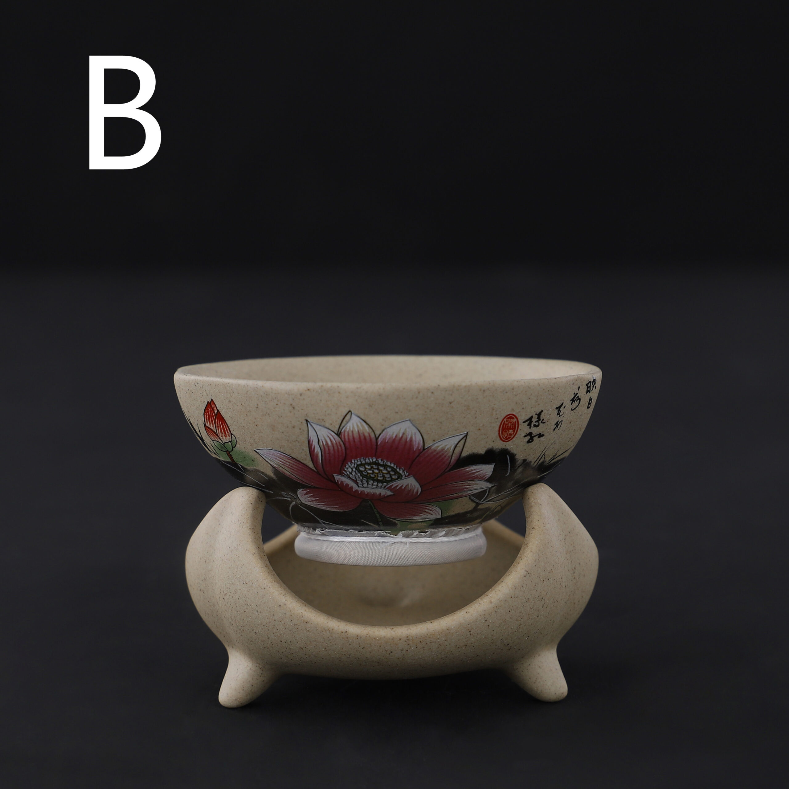 B : Le thé de lotus en stoneware glisse à travers le filet