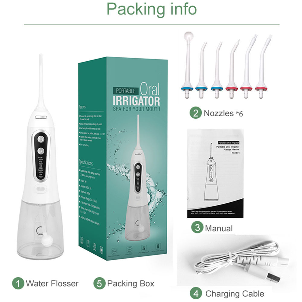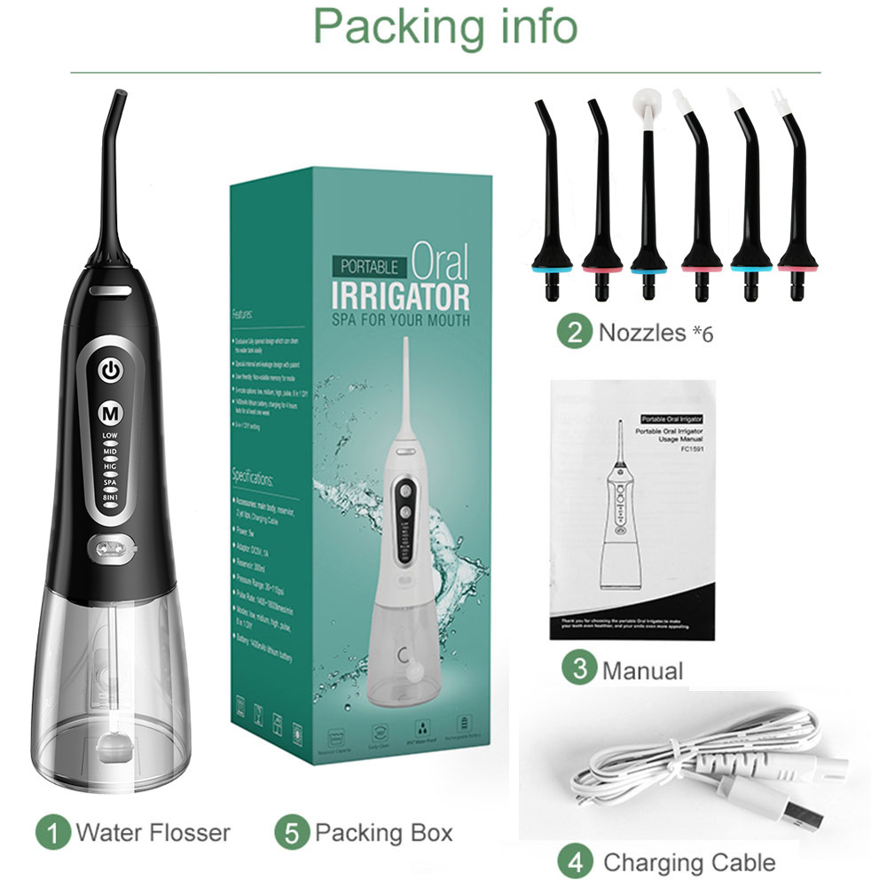 Chasse-dents*1, buse*6, câble de charge*1, manuel en anglais*1, boîte de couleur en anglais*1